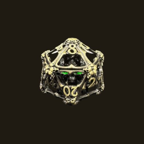 Gold and green hollow metal dice with a skull inside