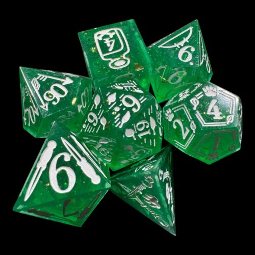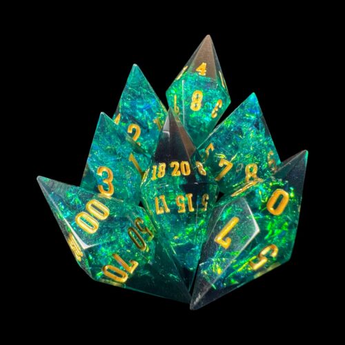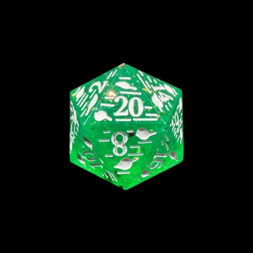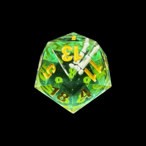 Green transparent sharp edge dice with mobile green+yellow draconic eye
