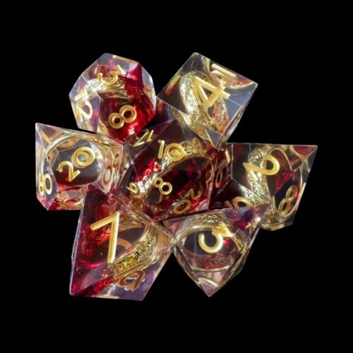 Red transparent sharp edge dice with gold leaf and liquid