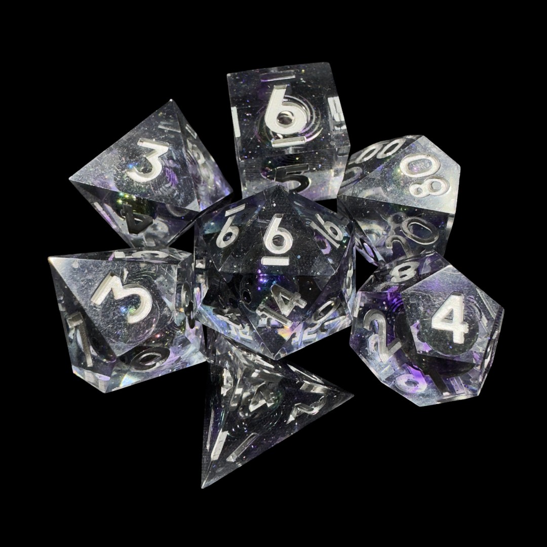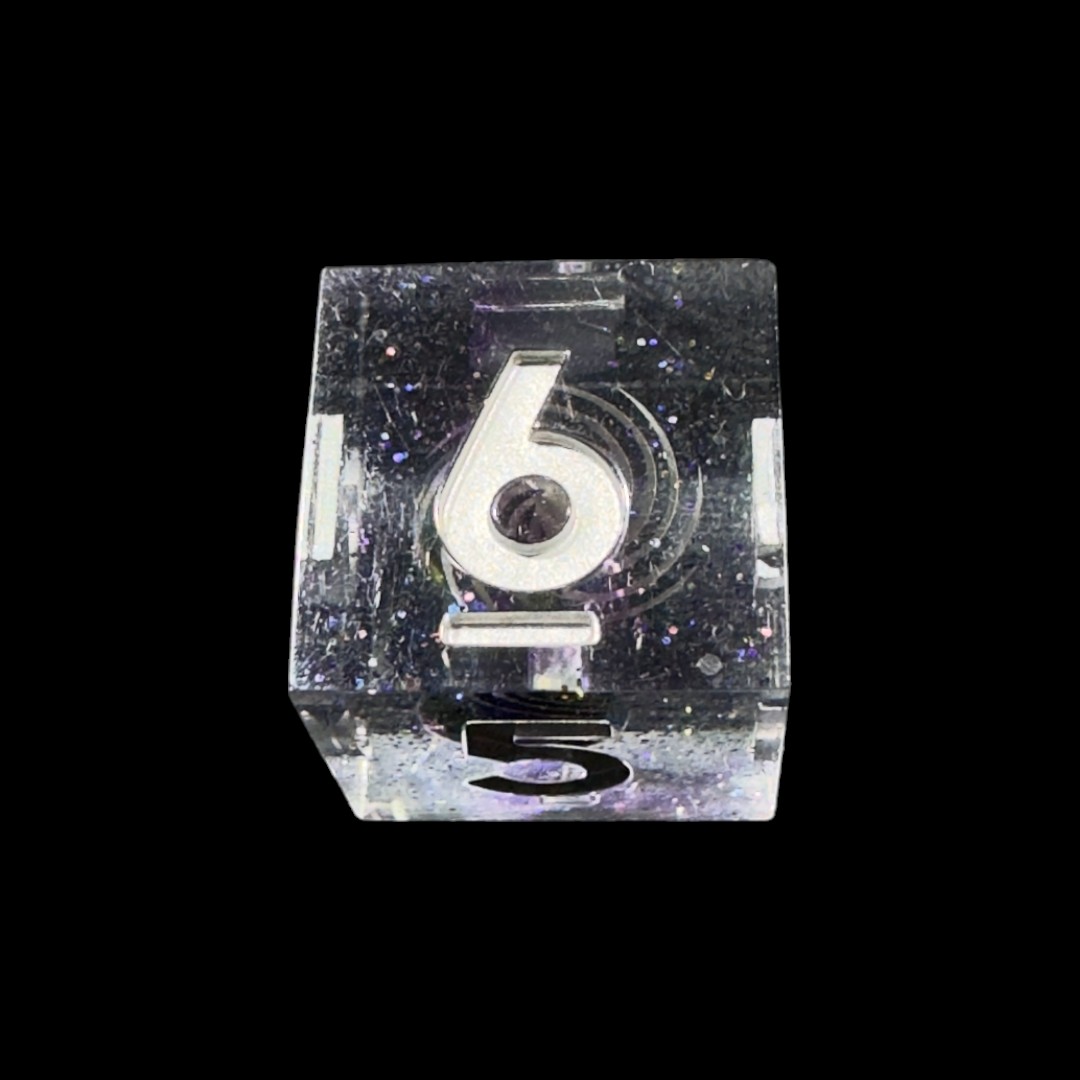 Each die contains a deep, dark core that seems to absorb light, creating a mesmerizing and one-of-a-kind visual effect. Perfect for those who love sci-fi settings, cosmic role-playing games, or simply want a unique and captivating dice set that captures both the eye and the imagination.
