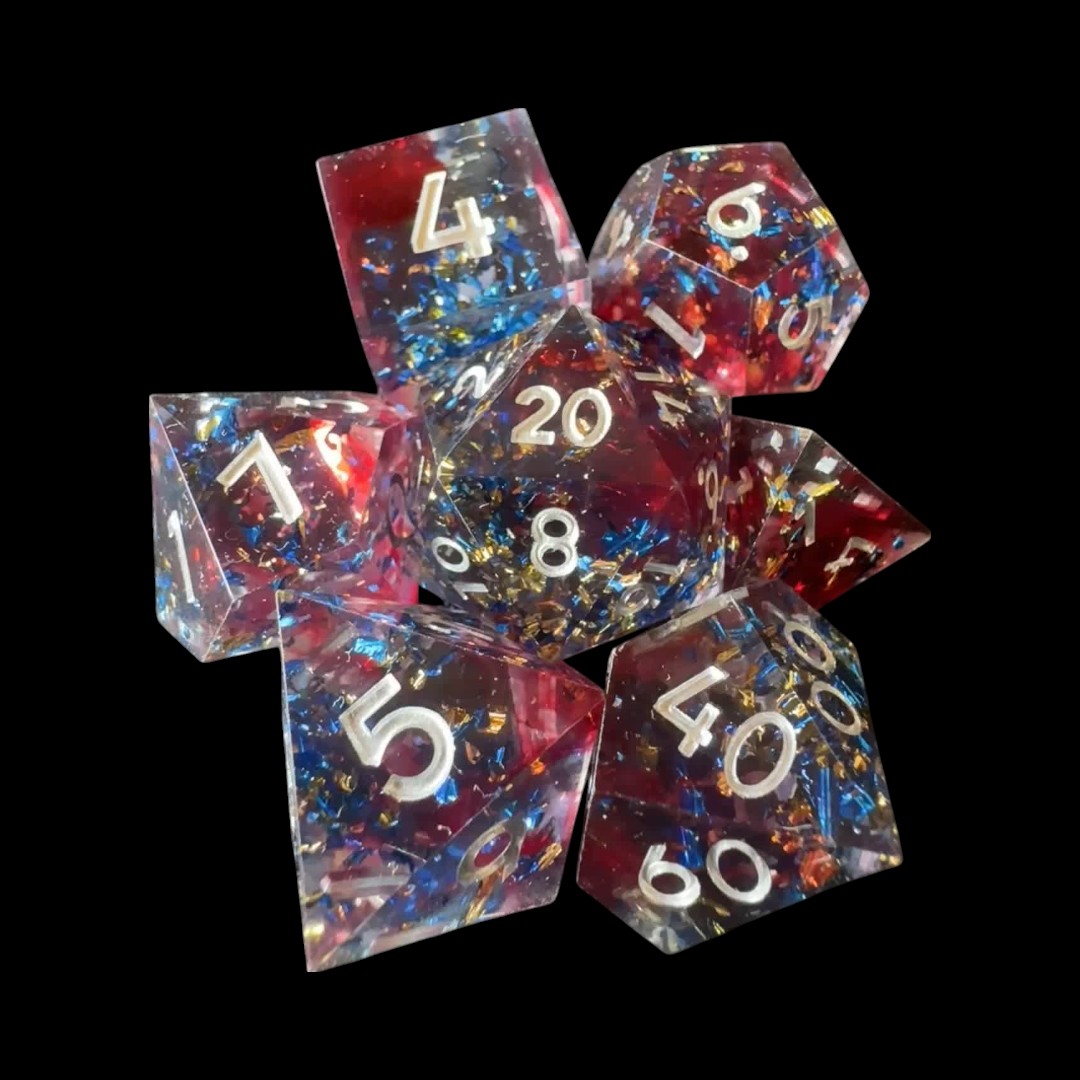 Immerse yourself in the beauty of the universe with this extraordinary set of polyhedral dice (d4, d6, d8, d10, d%, d12, and d20), each encased in clear crystal resin revealing an iridescent core, reminiscent of a galaxy suspended in space.