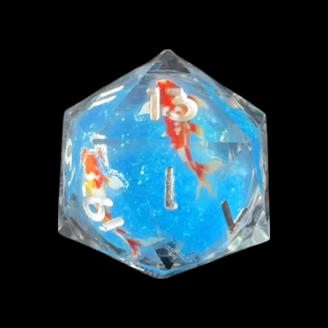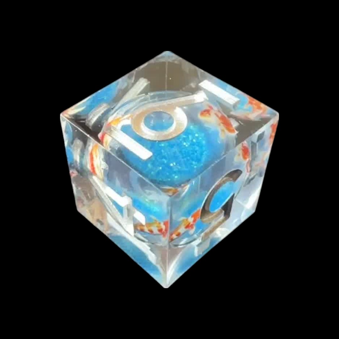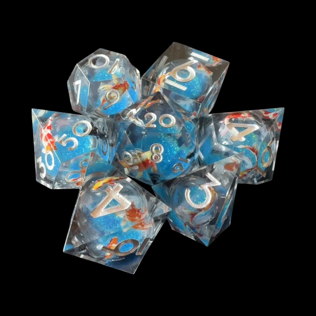 Each die (d4, d6, d8, d10, d%, d12, d20) contains a finely crafted koi carp inside—a symbol of strength, perseverance, and harmony. Enhancing each roll is a shimmering liquid that gently moves with every throw, creating dazzling plays of light and motion that bring each die to life.