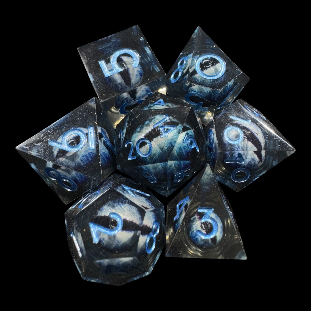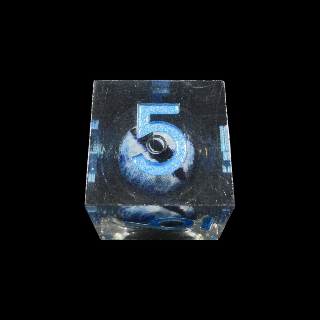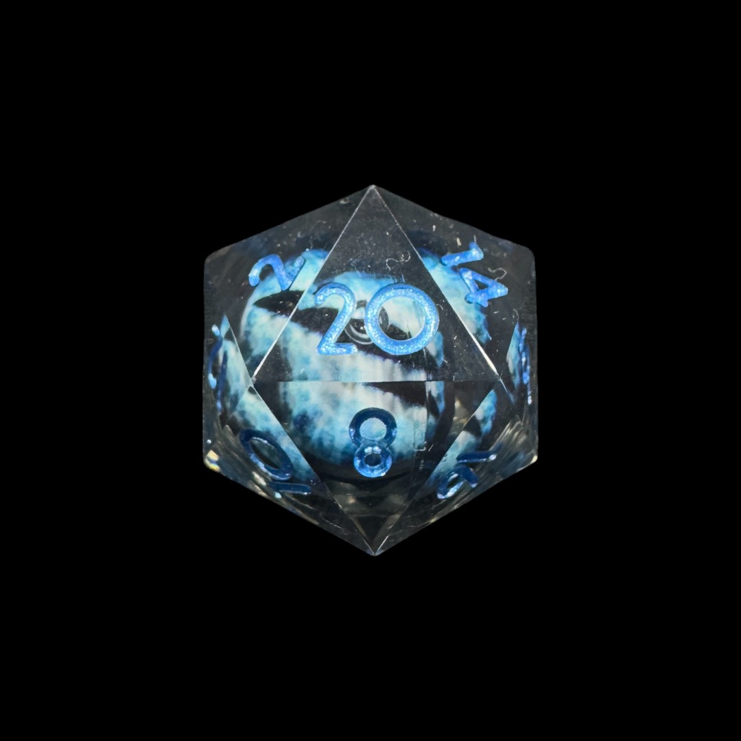 Black transparent sharp edge dice with mobile blue draconic eye