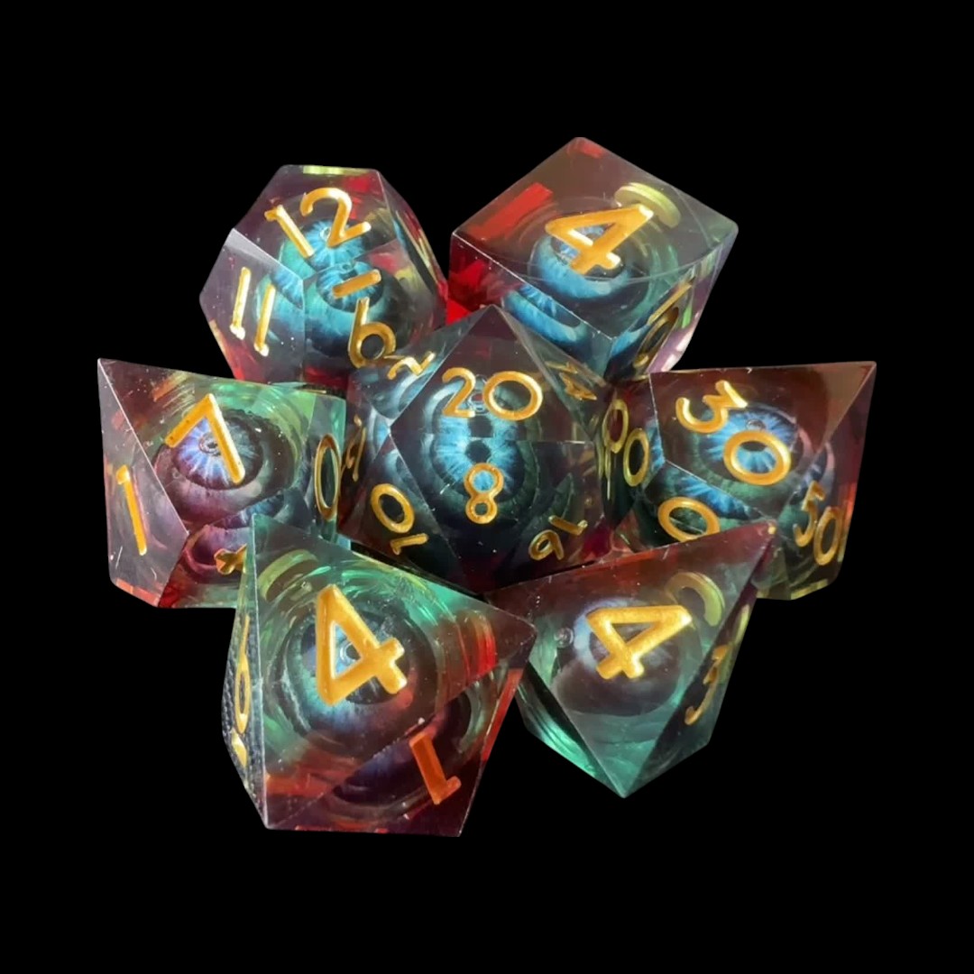 This captivating set of sharp-edged resin dice (d4, d6, d8, d10, d%, d12, d20) features a mysterious eye embedded at the center of each die.
