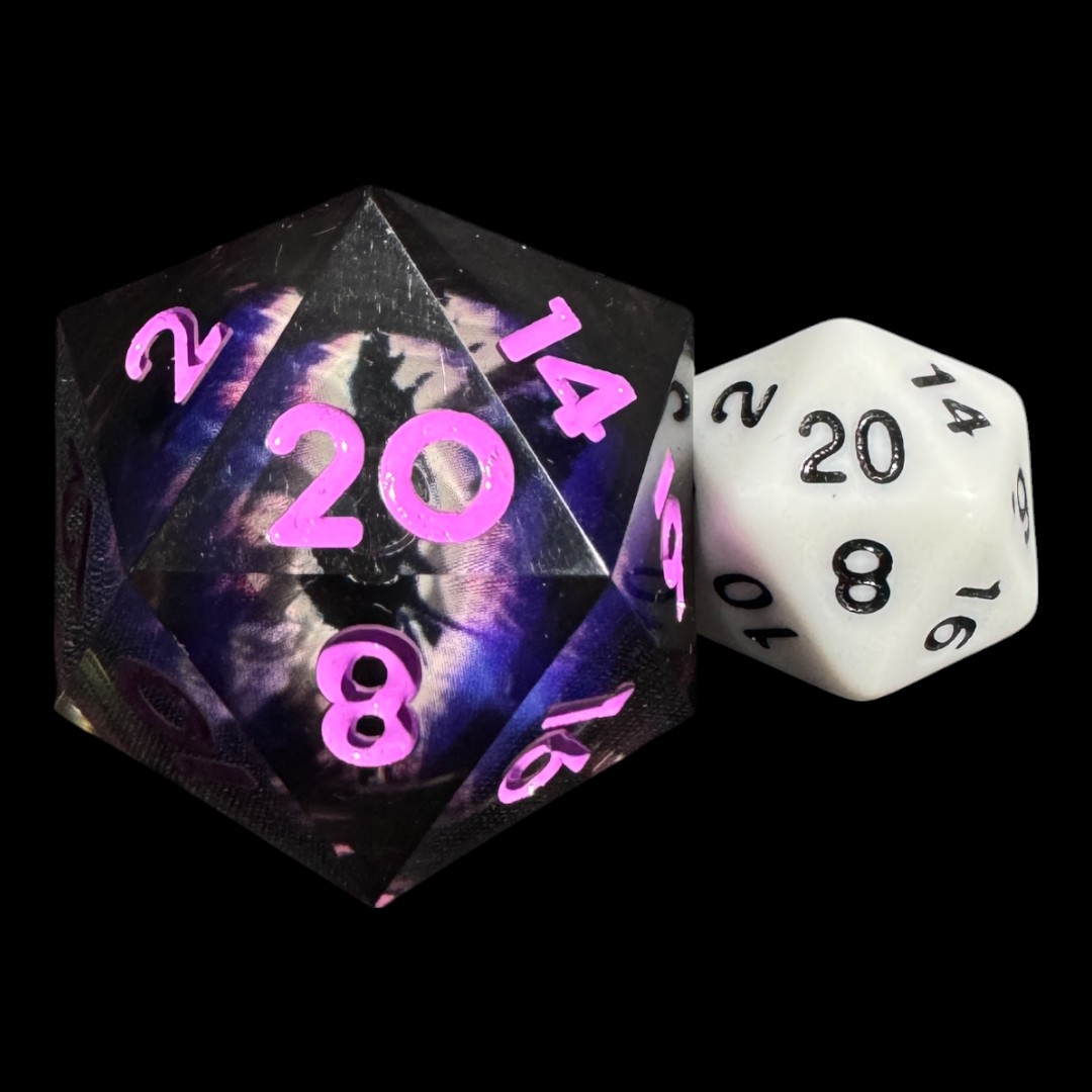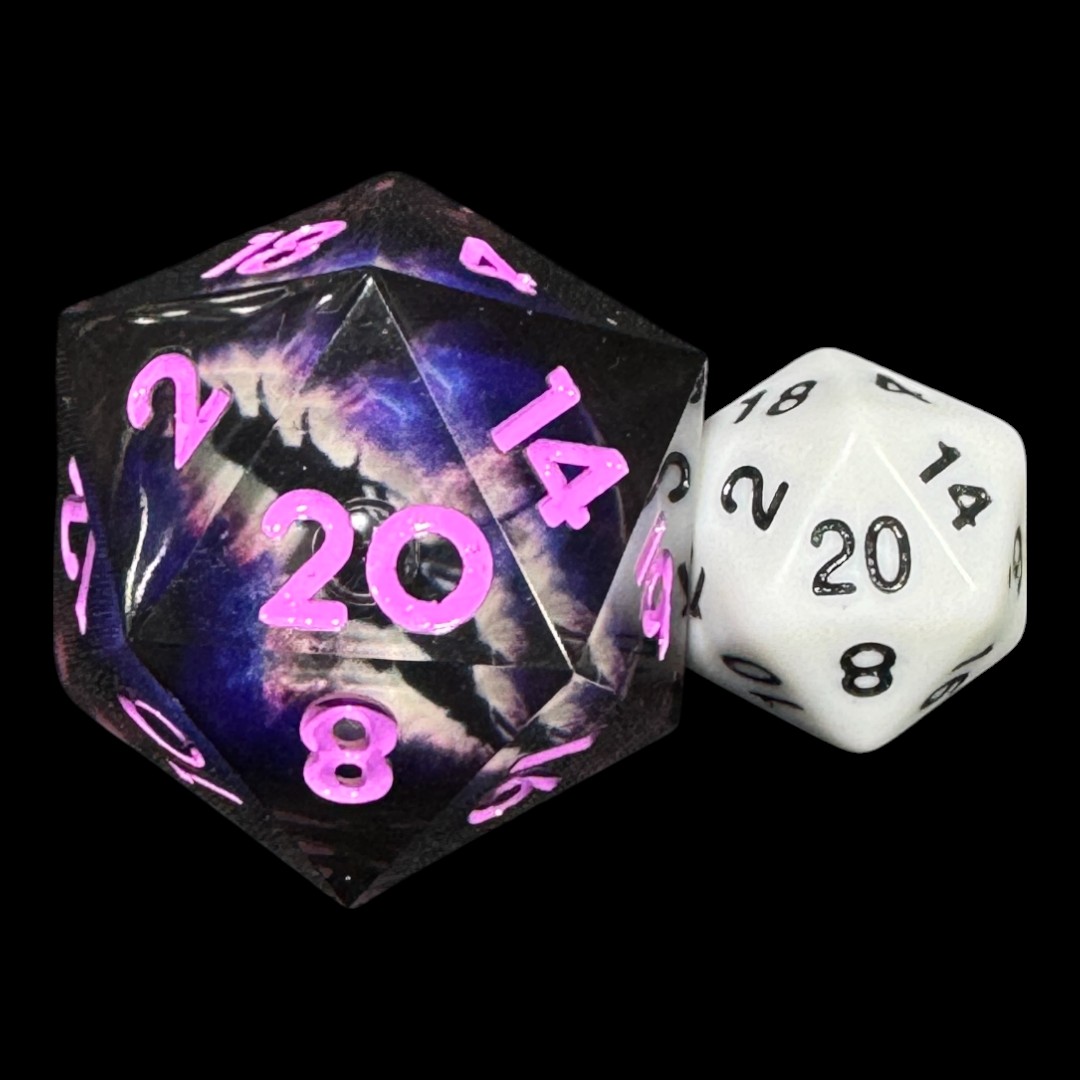 Crafted from high-quality transparent resin, the die offers optimal balance and a fascinating design, with engraved numbers for perfect readability. Whether it’s the symbol of an ancient artifact, a sign of a dark presence, or simply an extraordinary addition to your collection, this Living Eye D20 is ready to gaze into destiny with you.