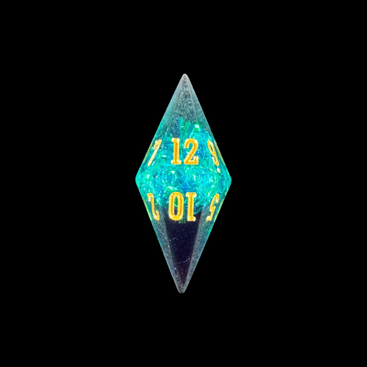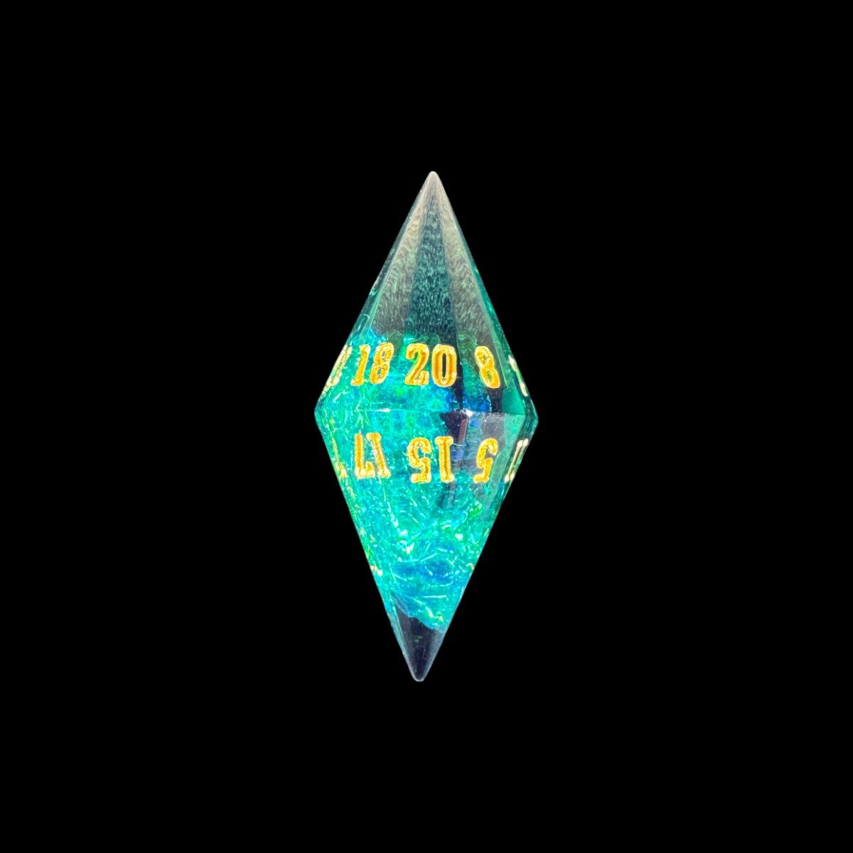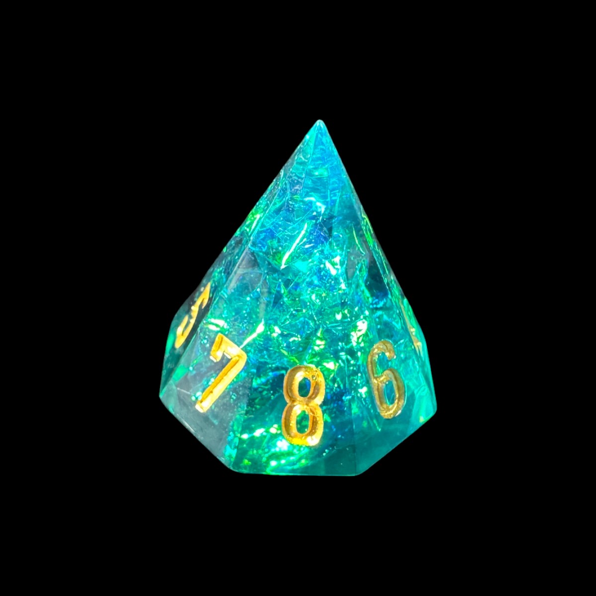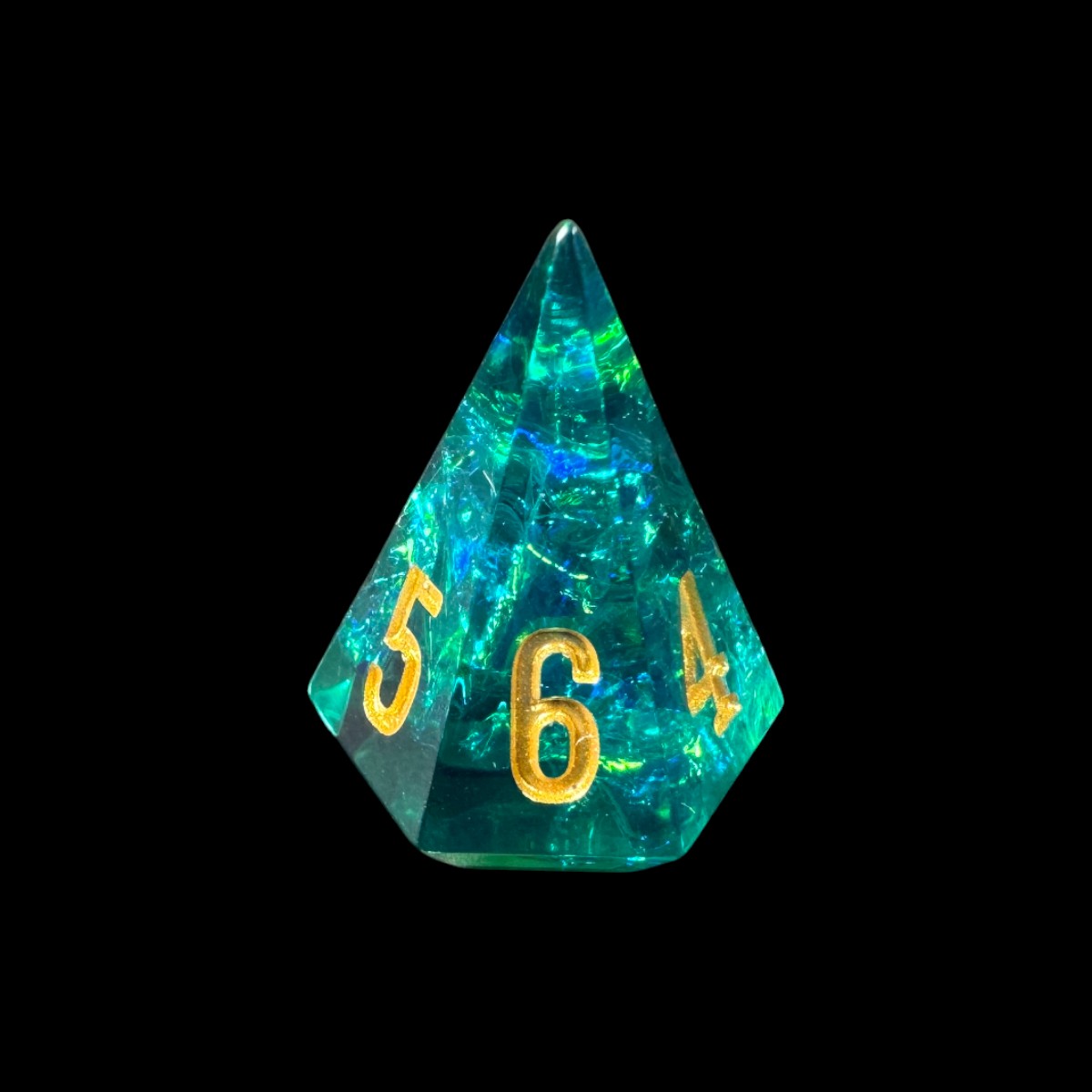 The distinctive feature of these dice is their crystal-inspired shape: the faceted surfaces and elongated structure resemble that of a natural gemstone, giving the dice an elegant and distinctive appearance. The translucent material, with its vibrant tones and luminous reflections, creates captivating light effects when the dice are moved or rolled on the table, making every throw even more evocative.
