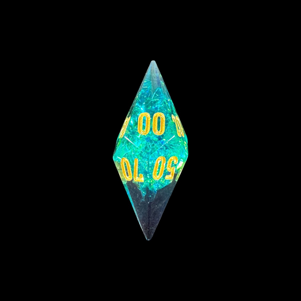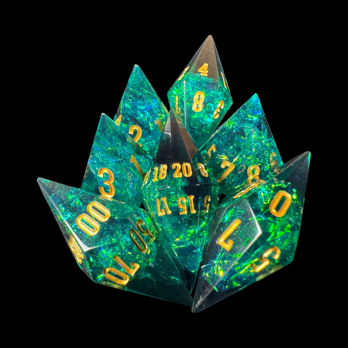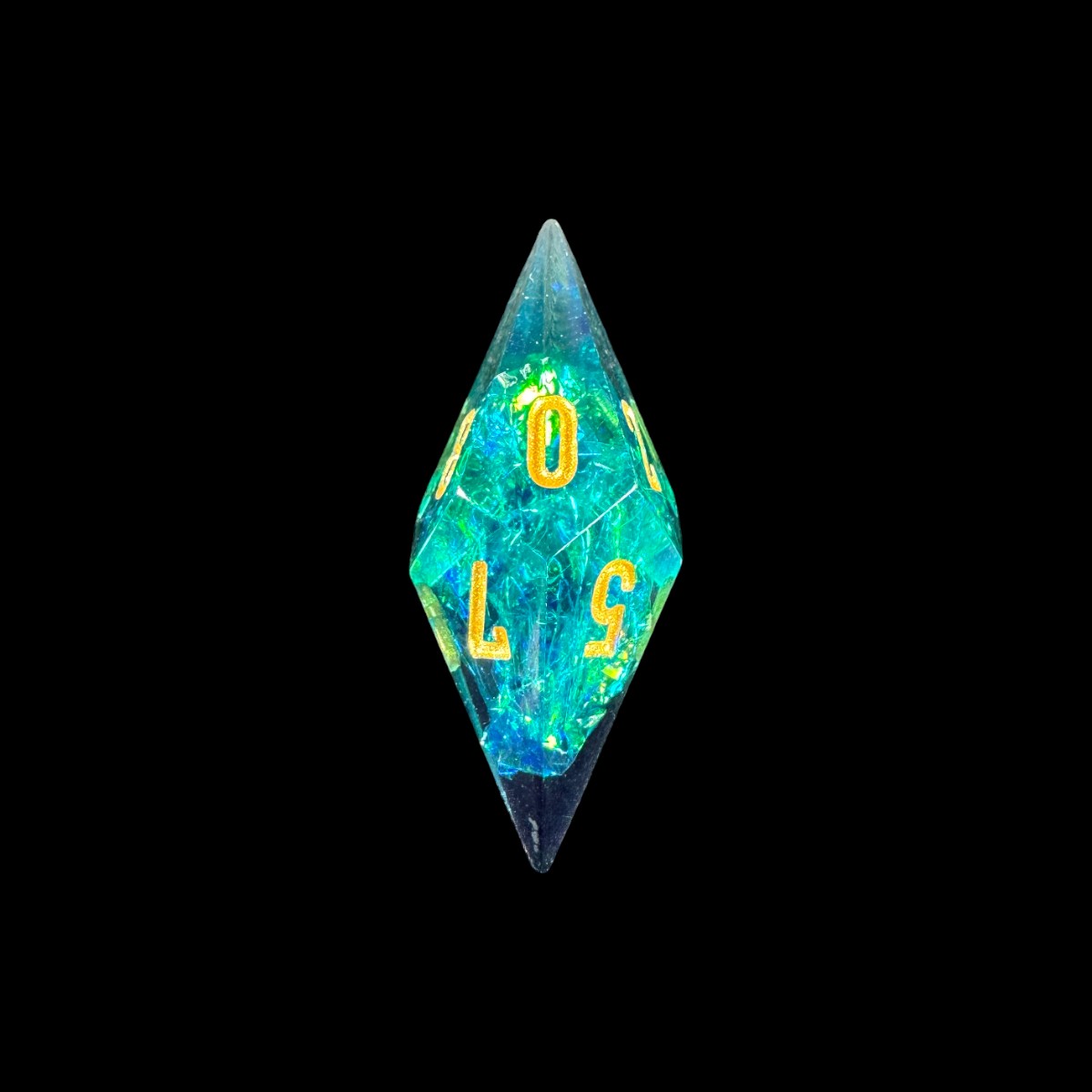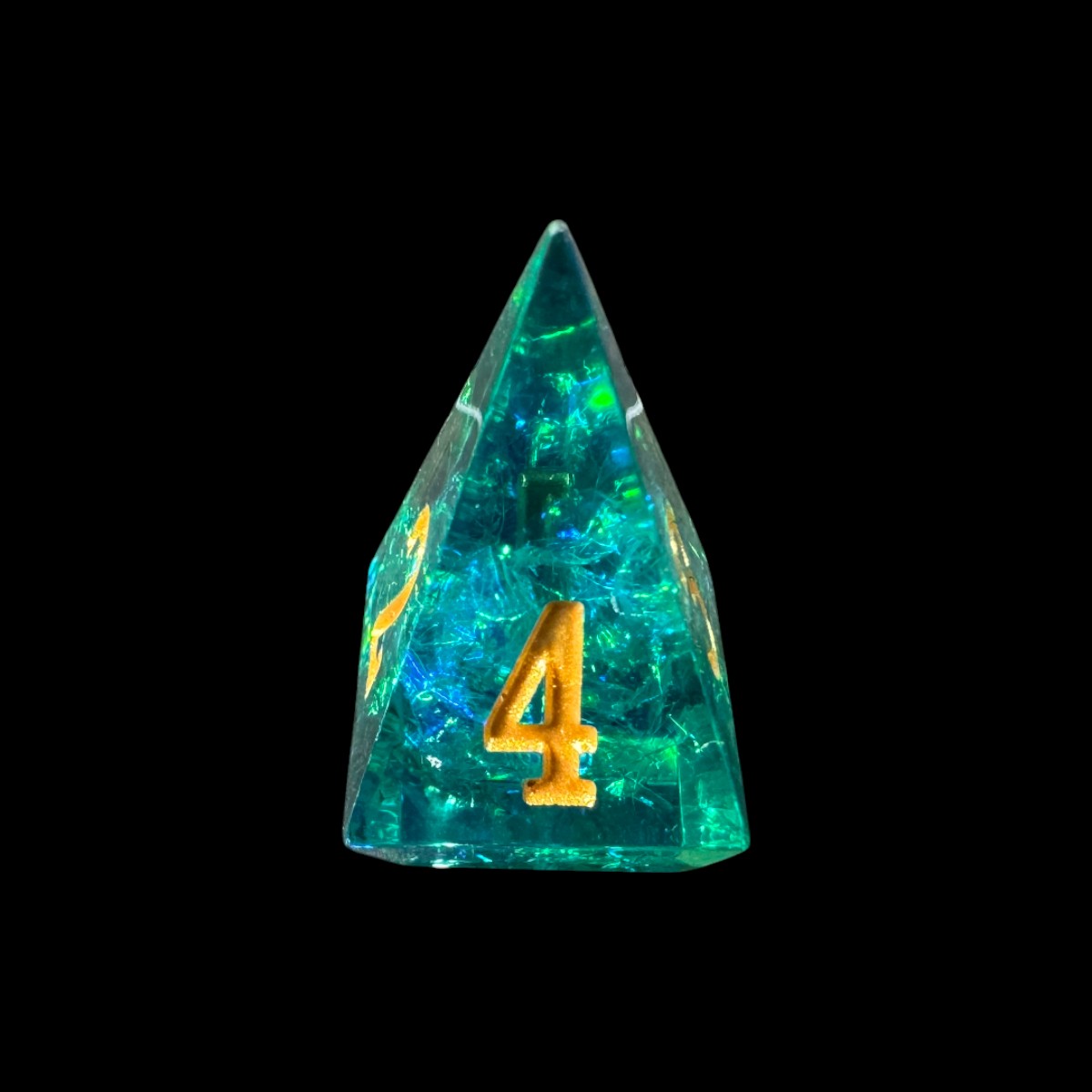 The distinctive feature of these dice is their crystal-inspired shape: the faceted surfaces and elongated structure resemble that of a natural gemstone, giving the dice an elegant and distinctive appearance. The translucent material, with its vibrant tones and luminous reflections, creates captivating light effects when the dice are moved or rolled on the table, making every throw even more evocative.