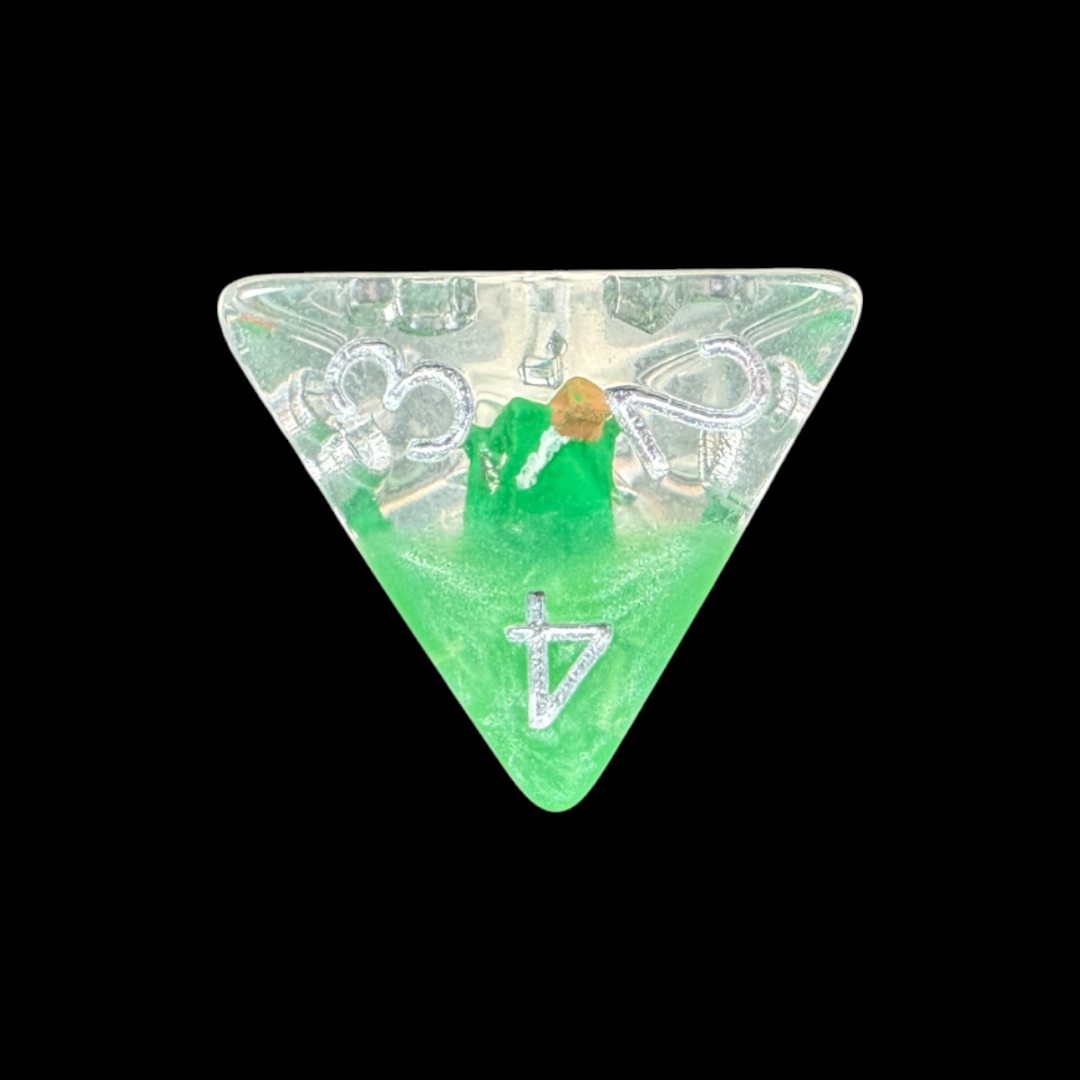 All’interno di ogni dado è racchiuso un Cubo Gelatinoso, una delle creature più celebri e temute dagli avventurieri. La miniatura appare sospesa nella resina, come se fosse intrappolata in uno spazio cristallizzato nel tempo. L’effetto tridimensionale, unito alla tonalità verde brillante, crea un richiamo visivo immediato e rende ogni dado unico nel suo genere.