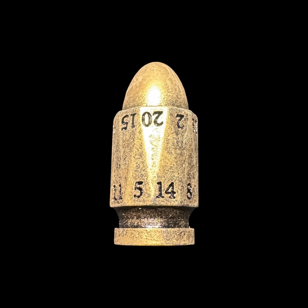 Ogni dado è modellato come un proiettile pronto a essere “sparato” sul tavolo, con le facce numerate incise con precisione e ben leggibili. La forma cilindrica, unita alla punta arrotondata, li rende visivamente unici e sorprendenti al lancio, trasformando ogni tiro in un momento scenico.