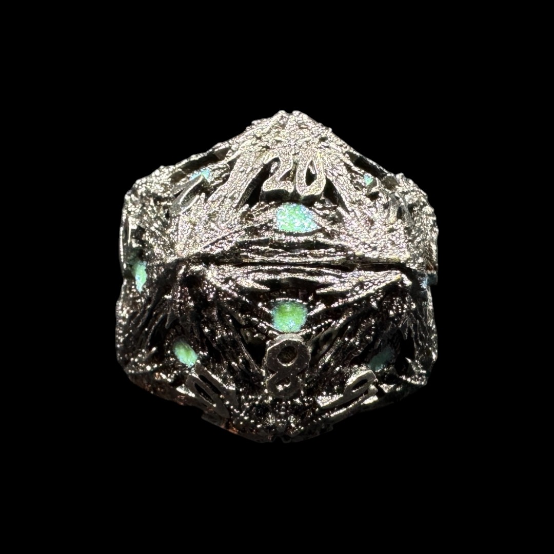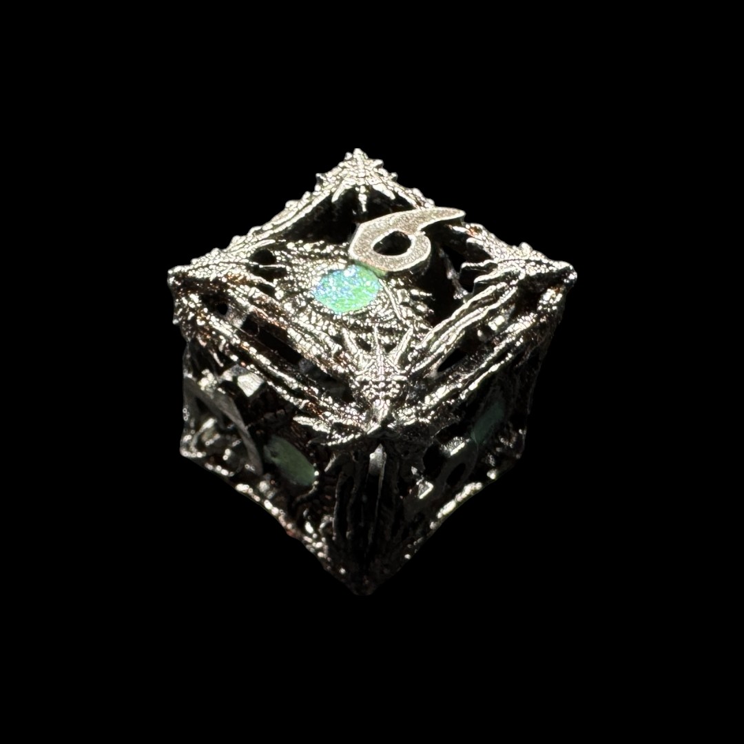 Realizzati in metallo cavo, questi dadi offrono una struttura resistente ma leggera, garantendo un perfetto equilibrio nel lancio. Il punto focale del design è l’occhio scolpito su ogni dado, all’interno del quale è incastonato uno zircone scintillante, che aggiunge un tocco di lusso e magia al set. Le cifre incise sono ben visibili, permettendo una lettura chiara senza compromettere l’estetica elaborata.
