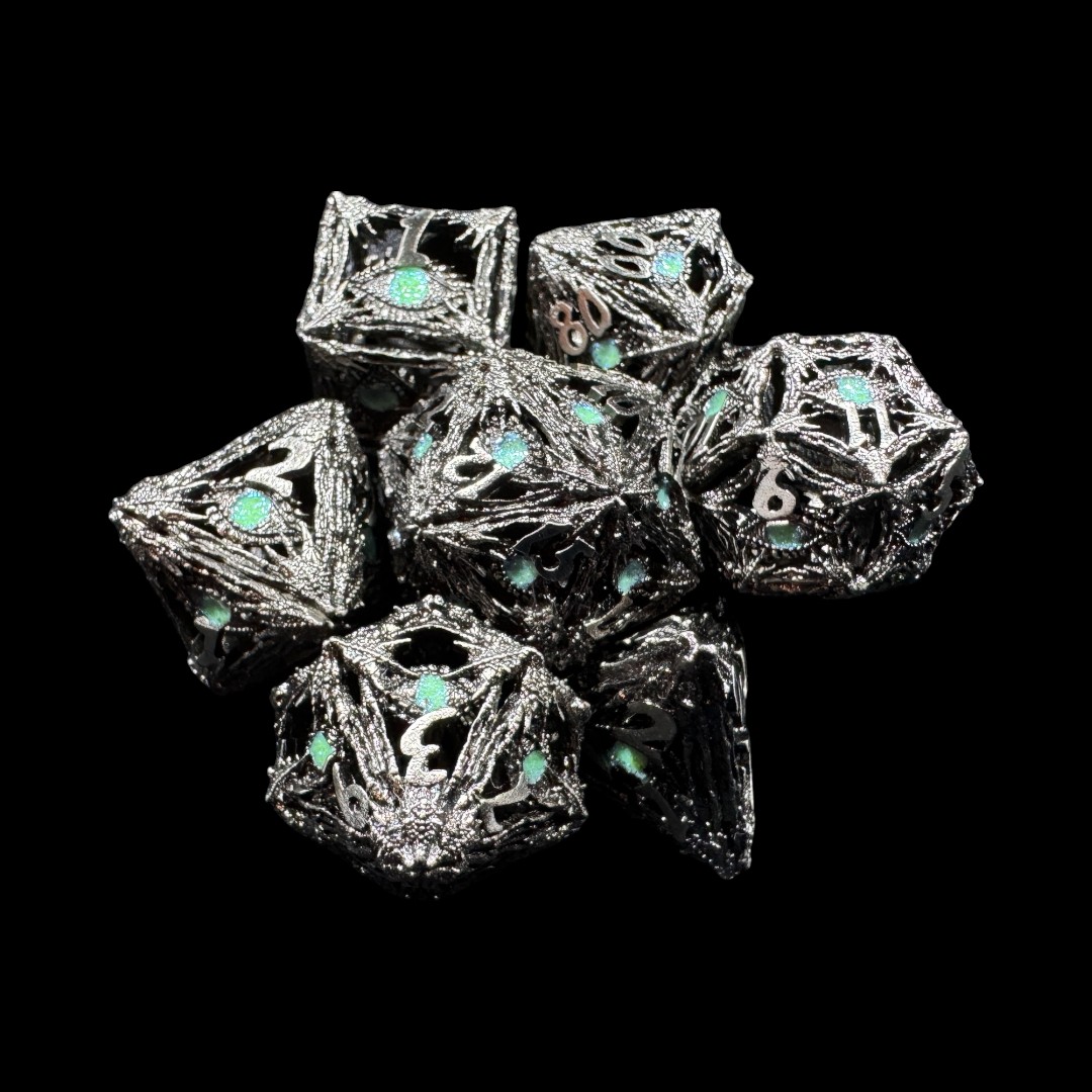 Questo straordinario set di dadi in metallo cavo è perfetto per giocatori e collezionisti che desiderano un accessorio tanto elegante quanto funzionale. Ogni dado (d4, d6, d8, d10, d%, d12, d20) è caratterizzato da un design intricato, ispirato a un occhio mistico, simbolo di saggezza e potere, impreziosito da dettagli scolpiti che ricordano antiche trame gotiche.