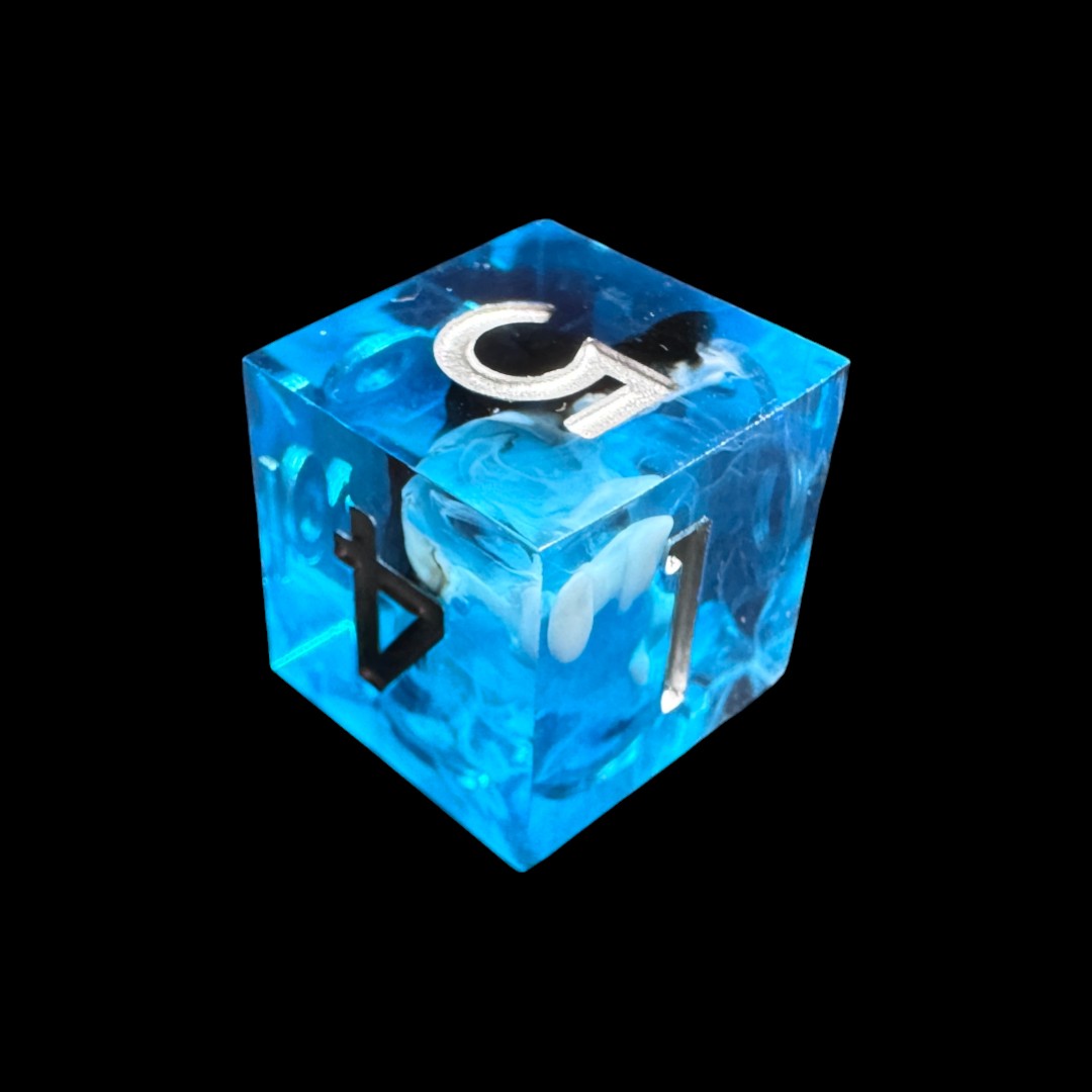 Le tonalità di blu e bianco si fondono all’interno dei dadi in un effetto visivo morbido e avvolgente, ricordando nuvole in movimento o onde marine che si infrangono. L’aspetto tridimensionale di queste venature interne rende ogni dado unico e affascinante, perfetto per chi cerca uno stile raffinato ma originale.