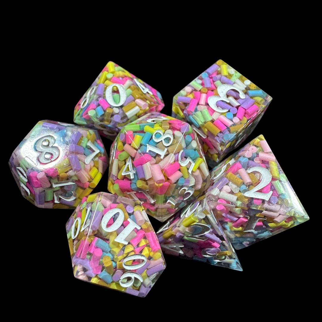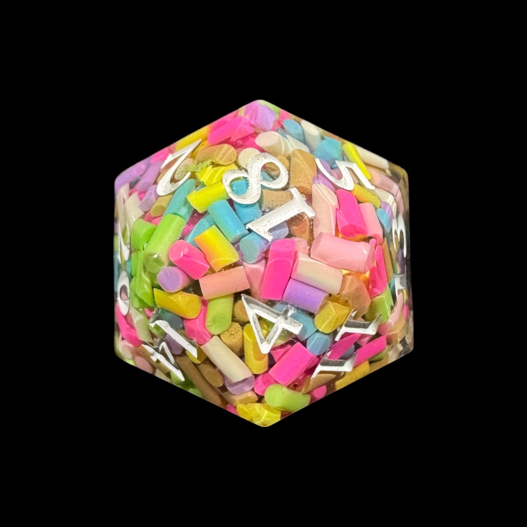 Aggiungi un tocco di colore e divertimento alle tue sessioni di gioco con questo irresistibile set di dadi poliedrici (d4, d6, d8, d10, d%, d12 e d20), caratterizzato dalla presenza di piccole caramelline multicolori incapsulate all’interno. Ogni dado sembra una dolce sorpresa, con le caramelle sospese in una resina traslucida che crea un effetto visivo unico e vibrante.