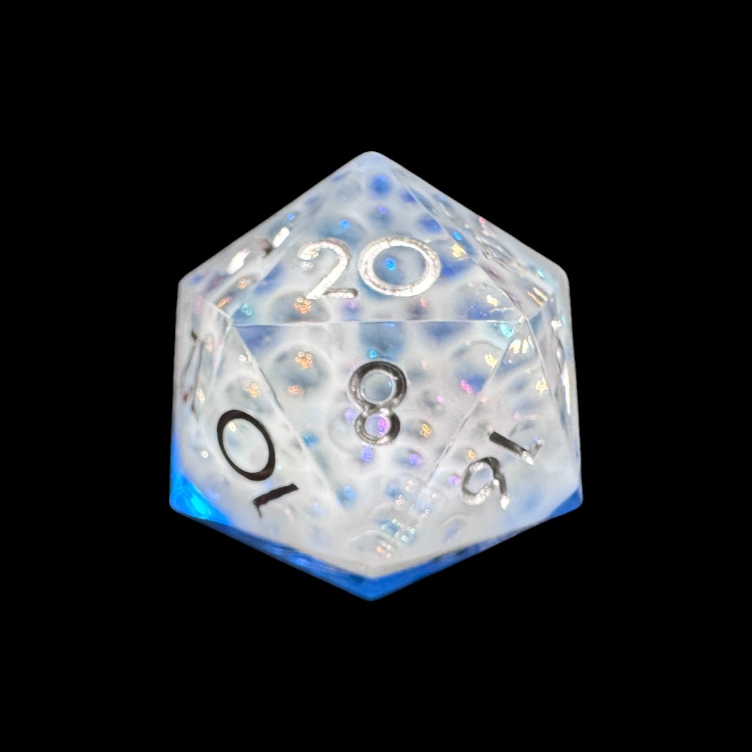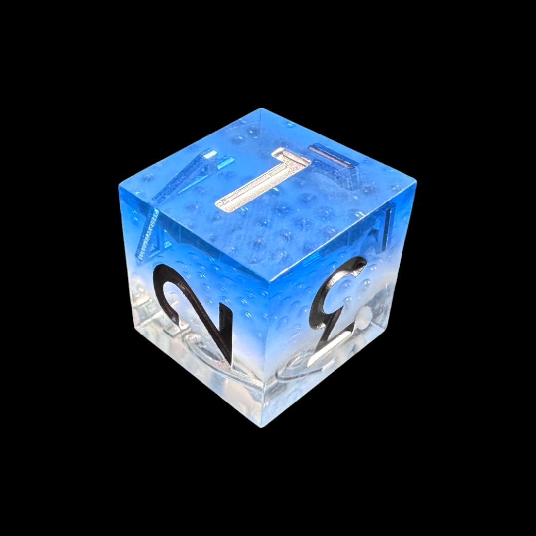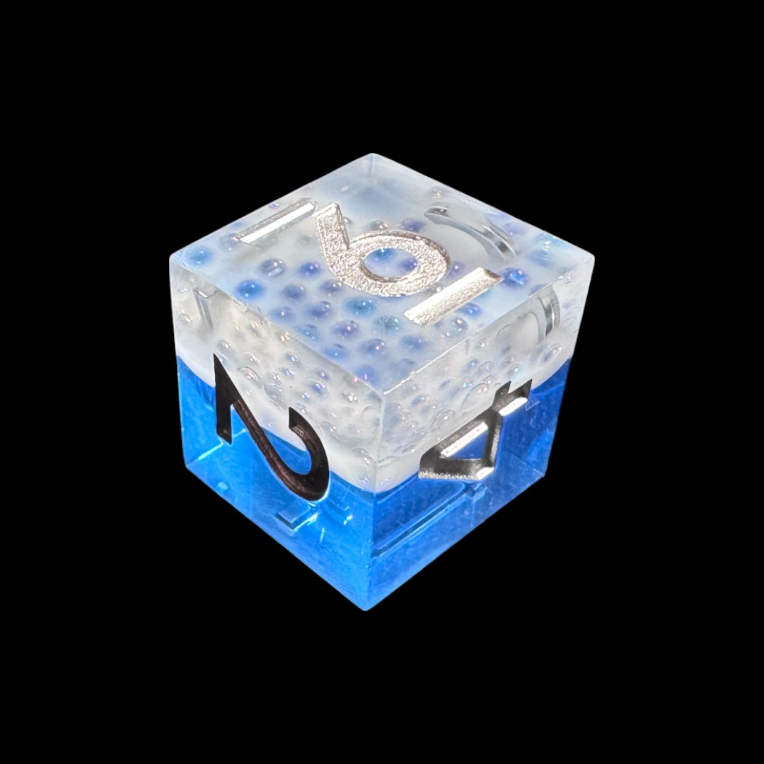 Il contrasto tra il blu intenso e la chiarezza della resina dona a questi dadi un aspetto fresco e sofisticato, ricordando l’effetto visivo di bolle d’aria intrappolate nel ghiaccio o immerse in acque profonde.