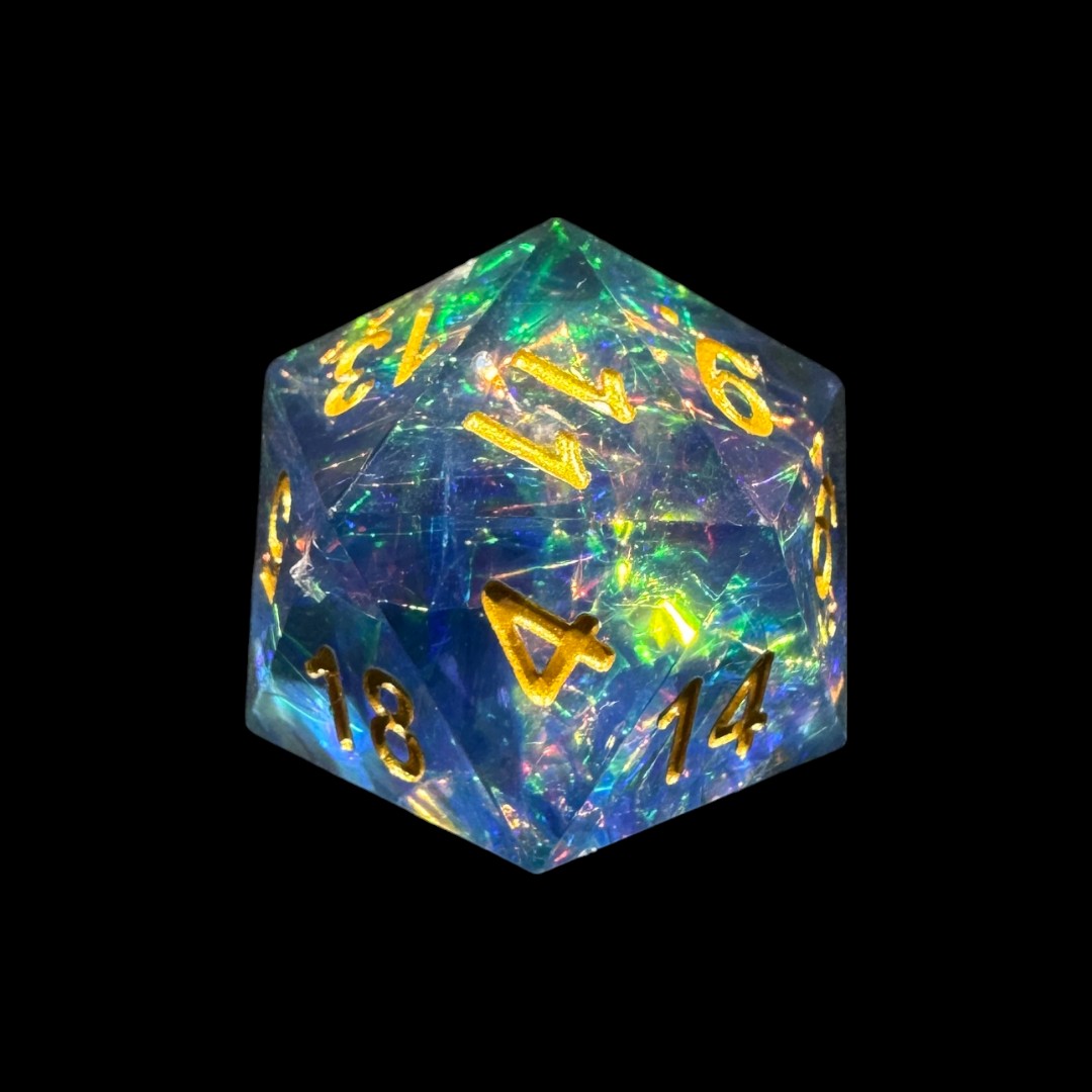 Grazie a un design raffinato e alla combinazione di colori che variano tra il blu, il verde e l’oro, questi dadi evocano la profondità dello spazio e il mistero delle nebulose. Ogni tiro si trasforma in un viaggio attraverso il cosmo, mentre i numeri incisi con finitura dorata o ramata risaltano elegantemente sulla superficie traslucida.