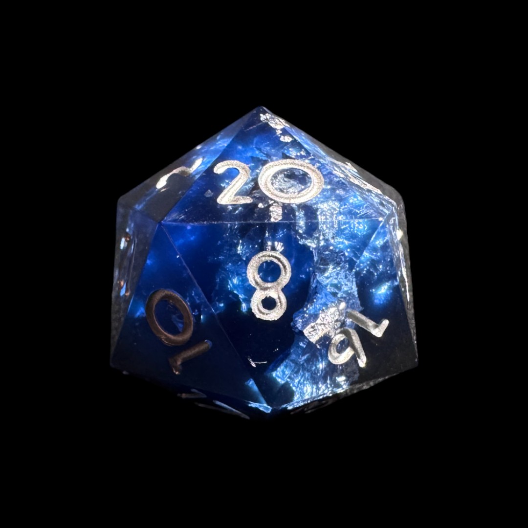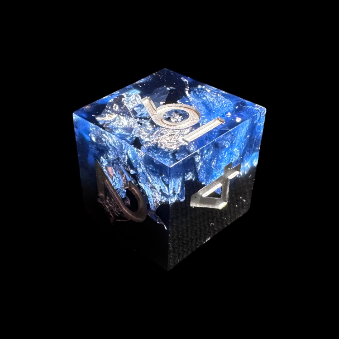 Al loro interno, frammenti di fogli di alluminio sembrano fluttuare come scaglie d’argento sospese nell’acqua, catturando e riflettendo la luce con un effetto scintillante e dinamico. Ogni dado è unico, con una composizione che richiama gioielli incantati o minerali magici provenienti da mondi lontani.