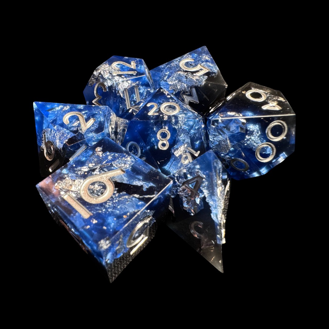 Questo raffinato set di dadi a spigolo vivo comprende i sette dadi essenziali per ogni avventura (d20, d12, d10, d%, d8, d6 e d4), realizzati in resina trasparente con sfumature profonde di blu e nero.