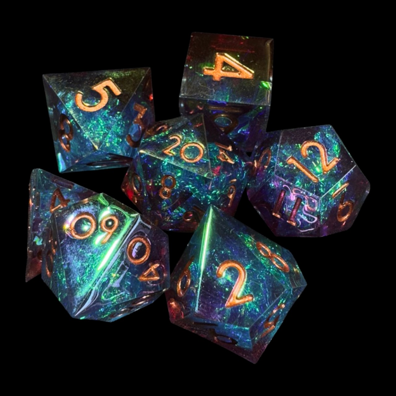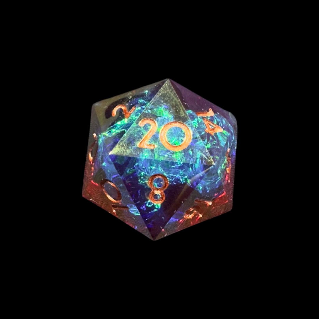 Set classico di dadi per RPG in resina a spigolo vivo da 18mm con le facce placcate elettroliticamente per conferire loro un riflesso caratteristico.