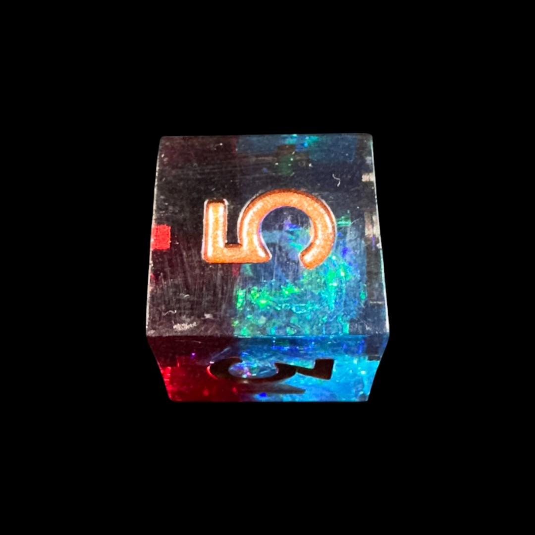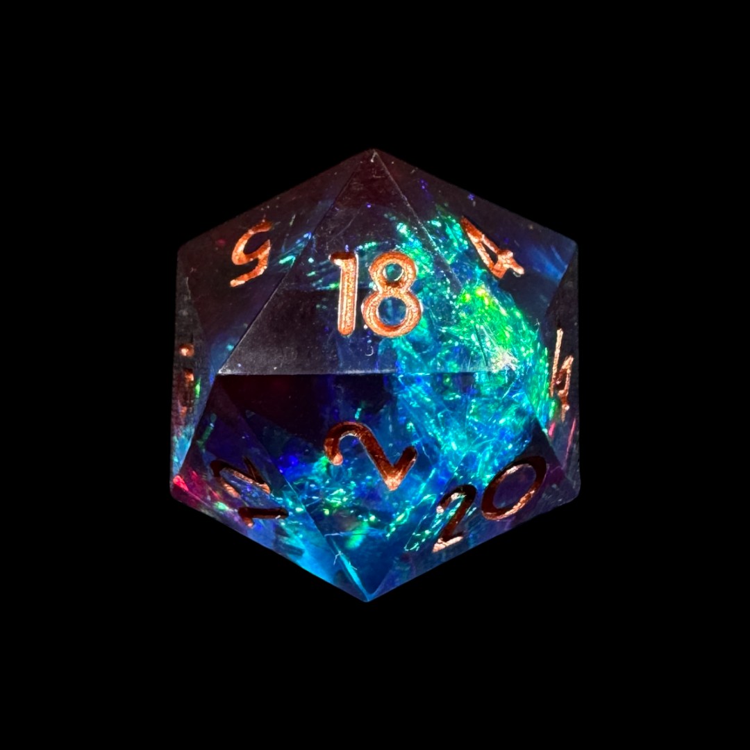 Grazie a un design raffinato e alla combinazione di colori che variano tra il blu, il verde e l’oro, questi dadi evocano la profondità dello spazio e il mistero delle nebulose. Ogni tiro si trasforma in un viaggio attraverso il cosmo, mentre i numeri incisi con finitura dorata o ramata risaltano elegantemente sulla superficie traslucida.