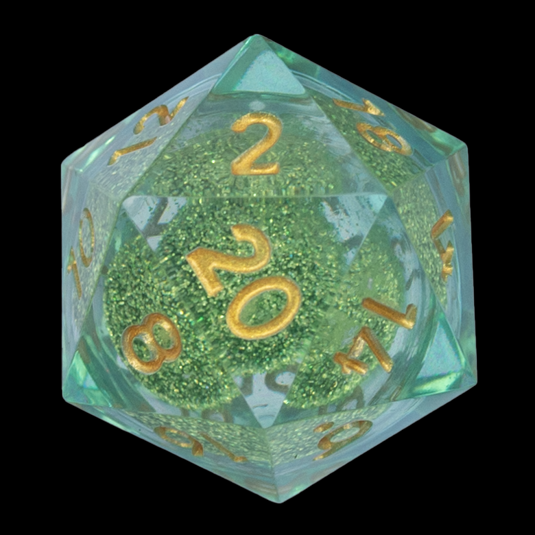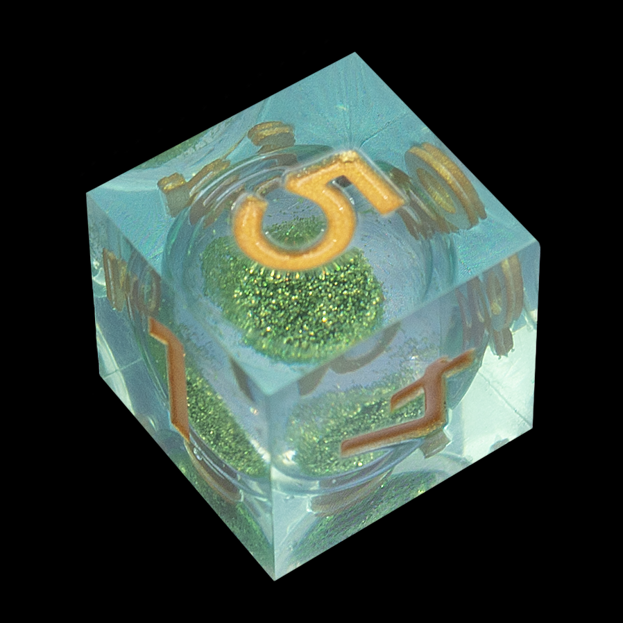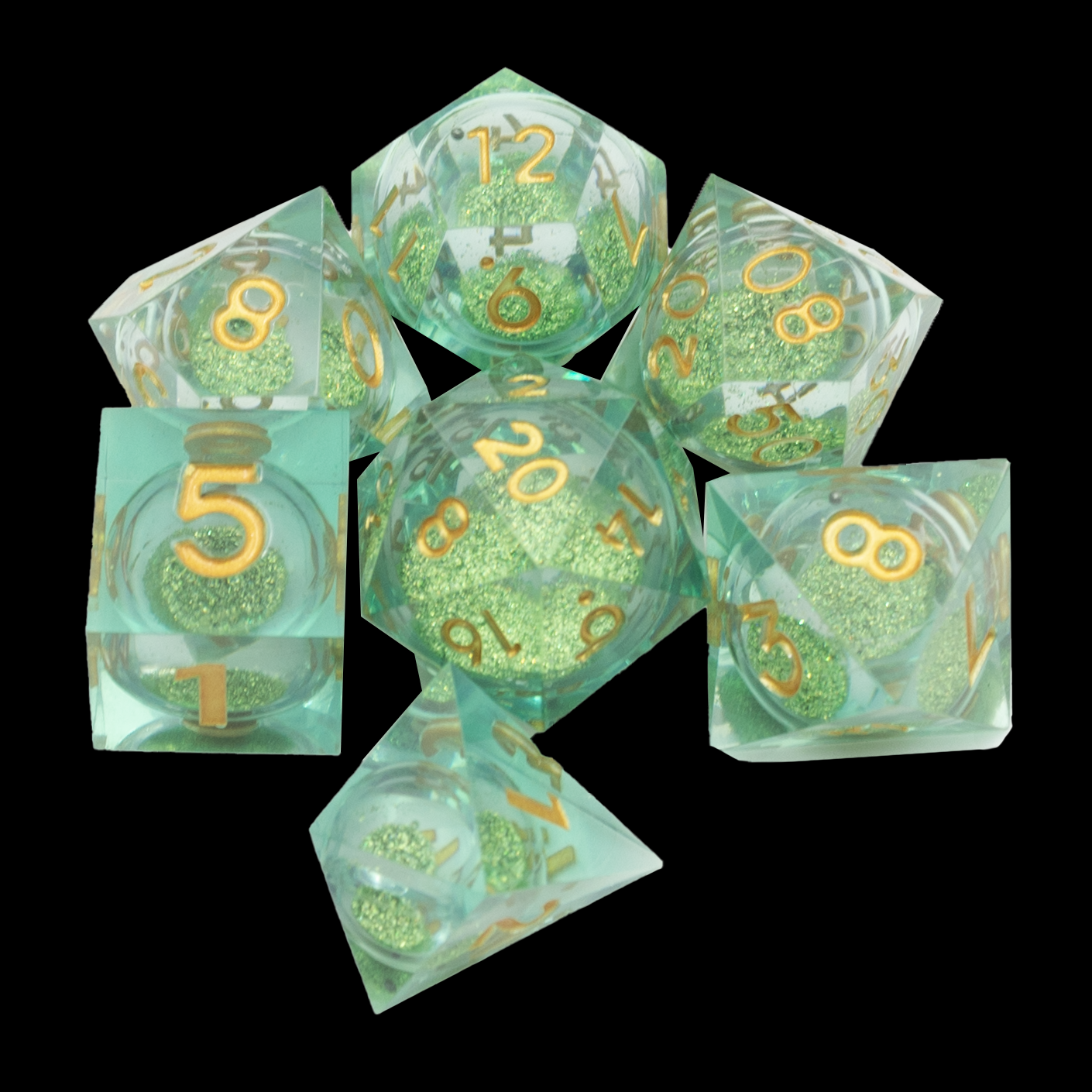 Set classico di dadi per RPG in resina a spigolo vivo da 18mm di colore verde con del liquido all’interno che quando si lancia il dado dà un effetto dinamico e magico