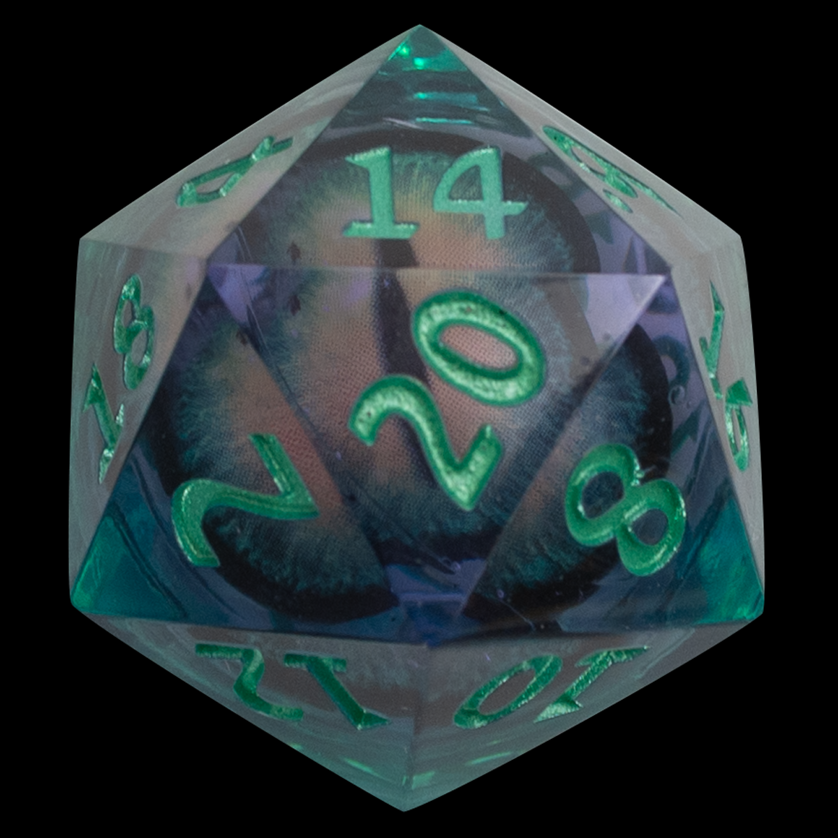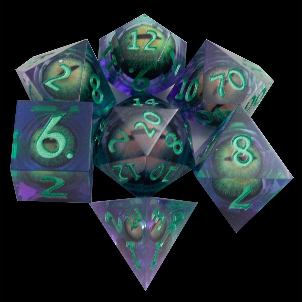 Set classico di dadi per RPG in resina a spigolo vivo da 18mm verde e viola con all’interno un occhio draconico che si muove quando il dado viene lanciato!